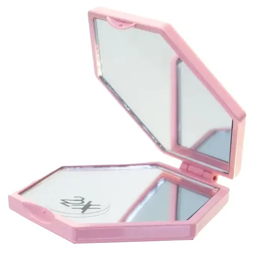 Abra o espelho de bolsa duplo, posicione na inclinação desejada, use como espelho normal ou espelho com aumento e feche após o uso.